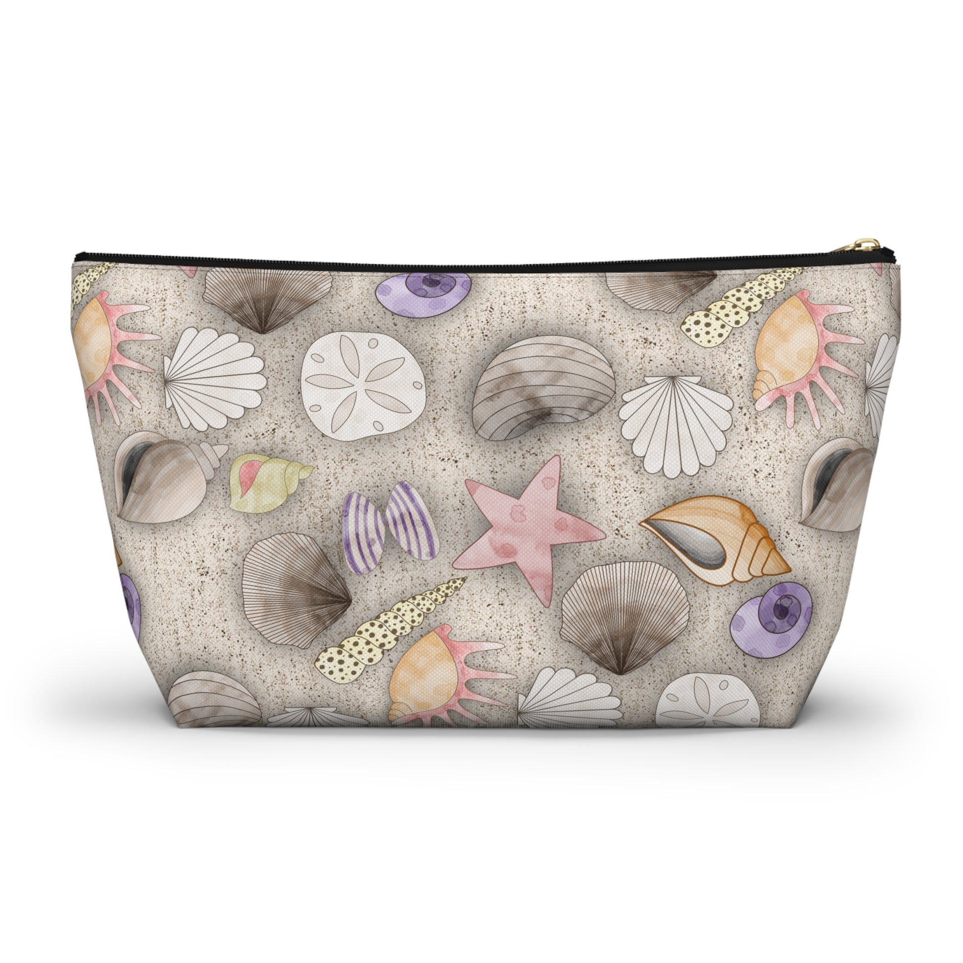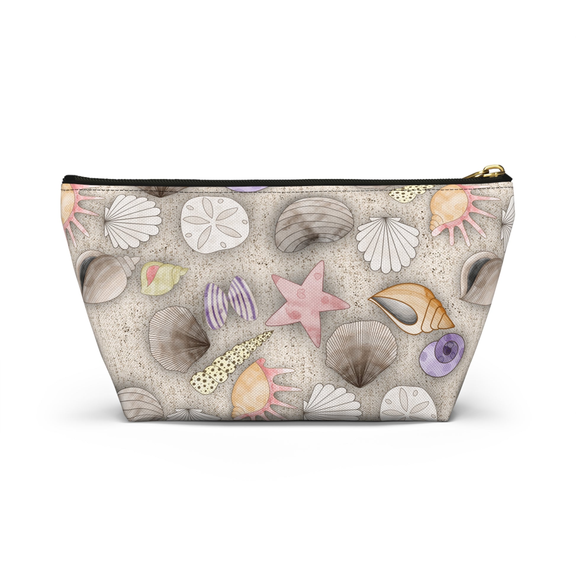 A soft, sandy-hued accessory pouch illustrated with delicate seashells, starfish, and sand dollars. Lightweight yet structured thanks to spun polyester and a T-bottom that lets it stand upright on a vanity or beach towel. The design feels like a gentle seaside walk at low tide—muted pastels and natural textures that soothe rather than shout. Use it to keep everyday essentials organized: makeup, sunscreen, chargers, or coins. The gold zipper pull adds a warm, finished touch against the coastal palette, and the interior laminate protects against spills and moisture so it travels well from handbag to shore.